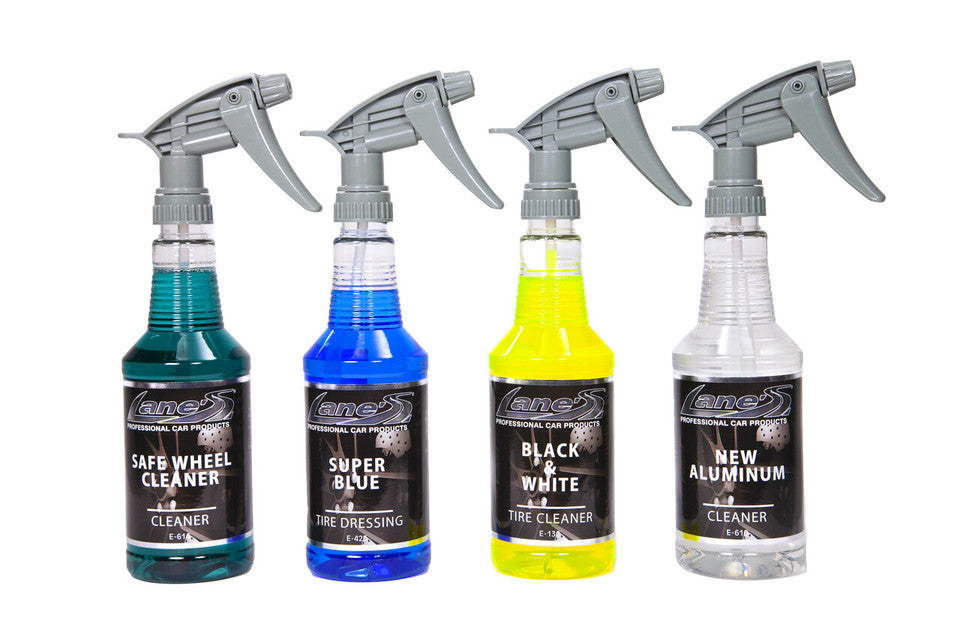 This Tire & Wheel Care Kit starts with Black White Tire Cleaner, the most concentrated bleach cleaner that attacks dirt and grime that has developed on the tire. This powerful cleaner makes cleaning all tires easy, even white lettering and whitewall tires. Next use Super Blue Tire Gloss, the most durable tire shine on the professional market today. Super Blue will provide a fast dry, long lasting protective shine that will last for weeks. Next, we include Safe Wheel. This non-acidic wheel cleaner is safe for cleaning all wheels. Safe Wheel will make your wheels stand out, cleaning chrome and aluminum wheels safely. Finally, in this great tire and wheel car care kit we include New Aluminum, the hottest wheel cleaner on the market today. There is no other aluminum wheel cleaner that has the strength of New Aluminum on the professional market. If you want to protect your tires and wheels this universal package is just what you need. Use Safe Wheel chrome wheel cleaner to clean chrome, polished, painted, and powder coated wheels. Use Black White Tire Cleaner to completely remove all dirt and grime from your tires. Use Super Blue Tire Shine to dress your tires after cleaning and drying. SKU (K-1007)