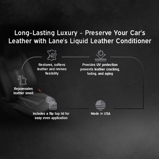 Take care of your car's leather seats with Lane’s Leather Conditioner. With one easy application, you can give your car the royal treatment and preserve the luxurious feel of your car’s leather upholstery for years to come. Our leather conditioner is uniquely formulated to provide superior protection against UV rays, cracking, fading and aging — so there's no need to worry about damage caused by environmental elements. It also quickly absorbs into the leather pores, ensuring that it transforms your leather into a soft, supple surface while enhancing its flexible characteristics. With these amazing benefits, Lane’s Leather Conditioner is the premium choice for preserving and protecting every aspect of your prized possession. So don’t hesitate - upgrade your ride and keep that fresh leather aroma with Lane’s Leather Conditioner! (E-419)