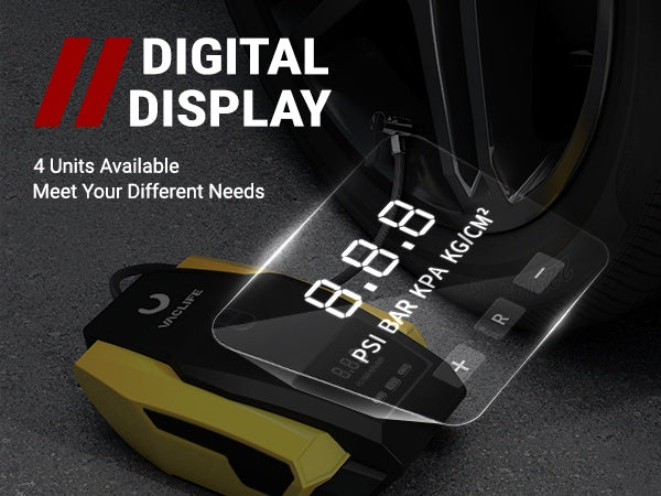 - [High Definition Digital Display Screen] This 12V DC car tire pump is equipped with a high-definition digital LCD display screen, allowing you to have a clearer understanding of tire pressure. There is no need to stop inflating and then use a tire pressure measuring device to measure the pressure separately, checking your car's tire pressure anytime and anywhere. This digital display can measure the tire pressure of KPA, PSI, BAR, KG/CM, and is easy to read in poor light conditions.